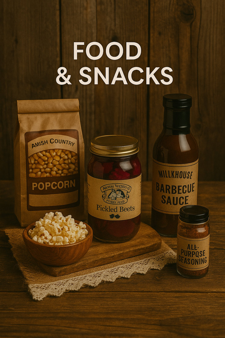 From sweet to savory, this collection is packed with old-fashioned flavor. Explore Amish-made popcorn, zesty pickled vegetables, handcrafted sauces, and bold seasonings—all made with simple, honest ingredients. Perfect for pantry staples, gift baskets, or your next snack break.