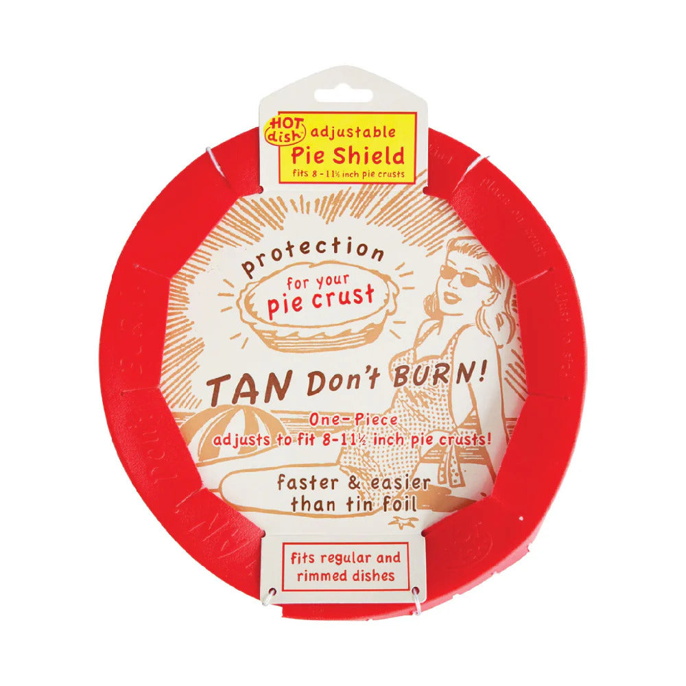 Protect crust from burning throughout the entire baking process. One-Piece Pie Shield adjusts to fit regular or rimmed pie dishes from 8" to 11.5" in diameter.
